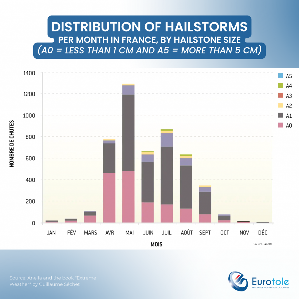 Câest lâavis des spĂ©cialistes de la mĂ©tĂ©o qui identifient le mois de Mai comme un mois historiquement Ă fort risque grĂȘle et notamment dans le sud/ouest, en raison de la forte activitĂ© orageuse liĂ©e Ă lâarrivĂ©e dâun air plus chaud.